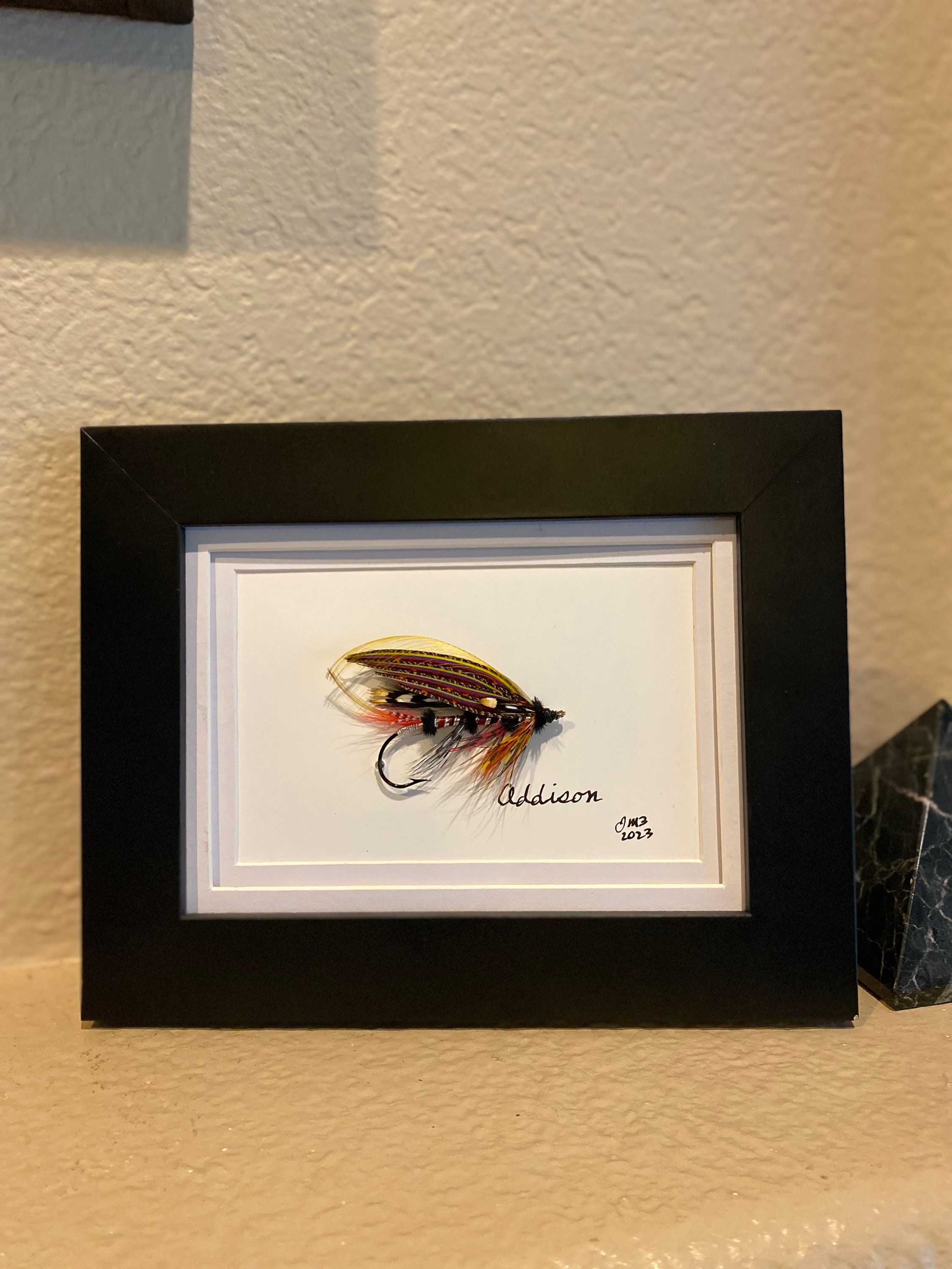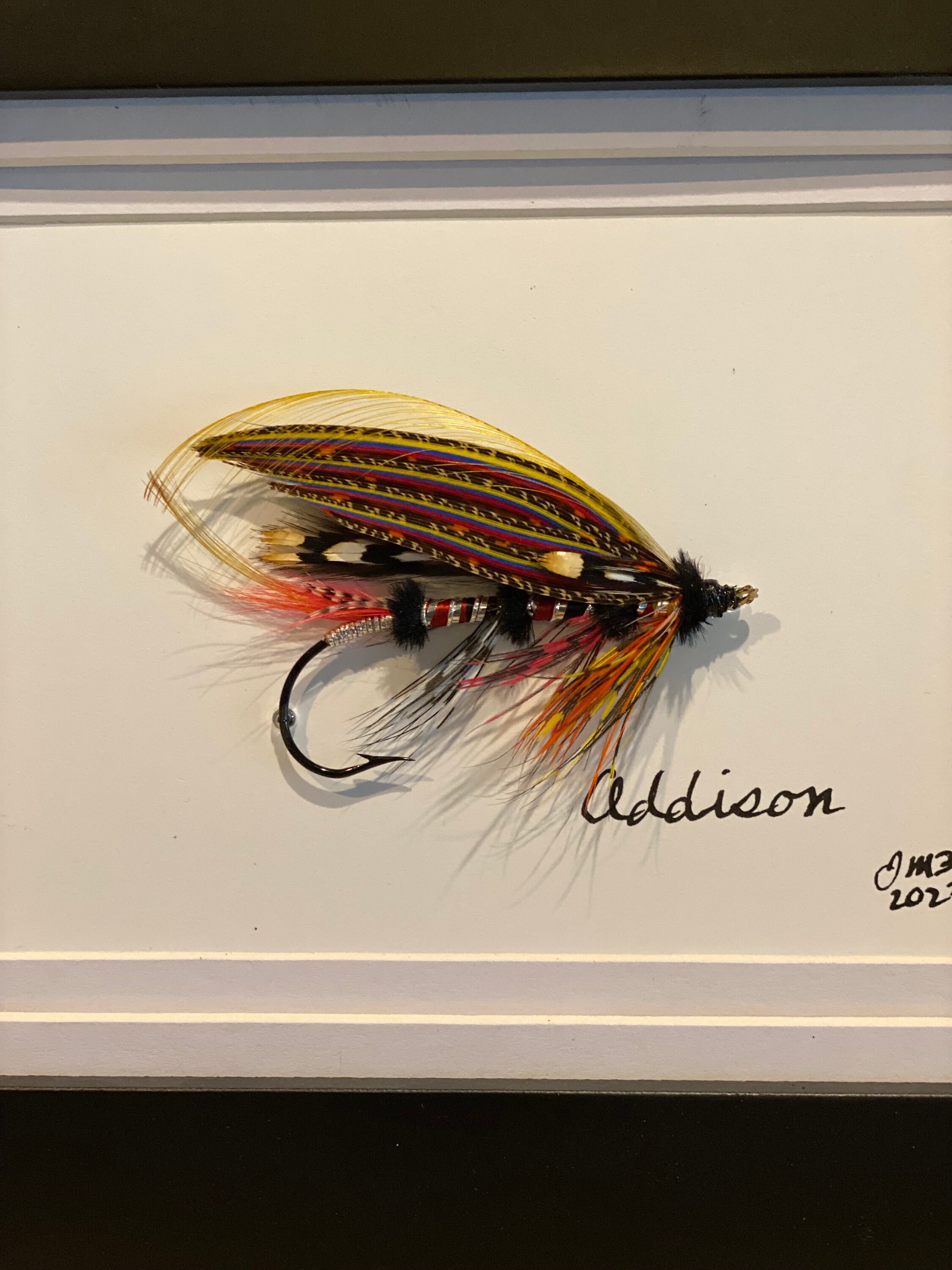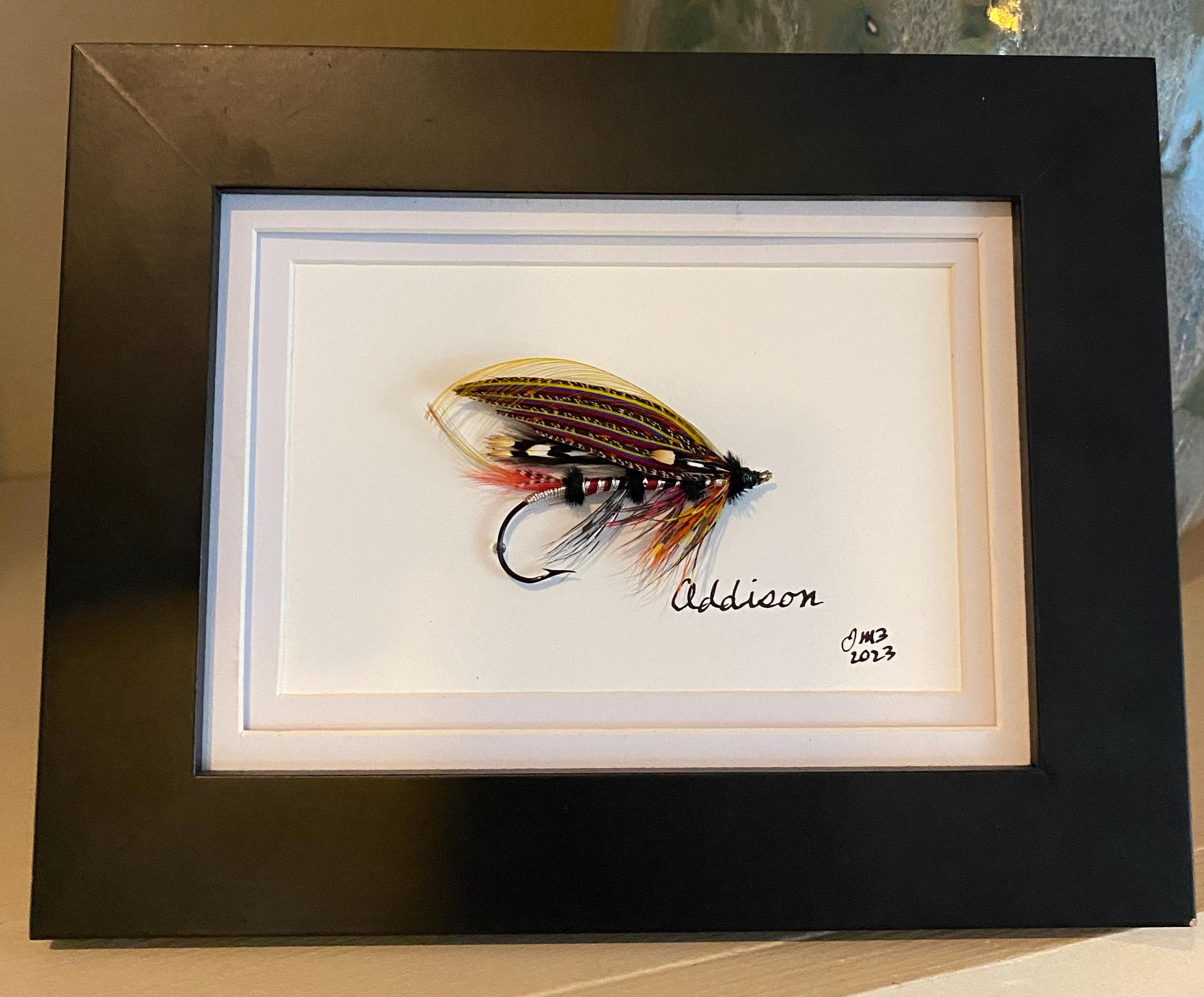As a lifelong trout & salmon fly fishing and tying enthusiast, I enjoy dressing and sharing artistic expression through classic and authentic fly design – Addison is a freehand design - dressed on a 5/0 2x Garamond blind eye hook with a Spanish silk gut loop. A list of all feathers and materials is included with each fly. *All materials and feathers are procured from ethically sourced providers.