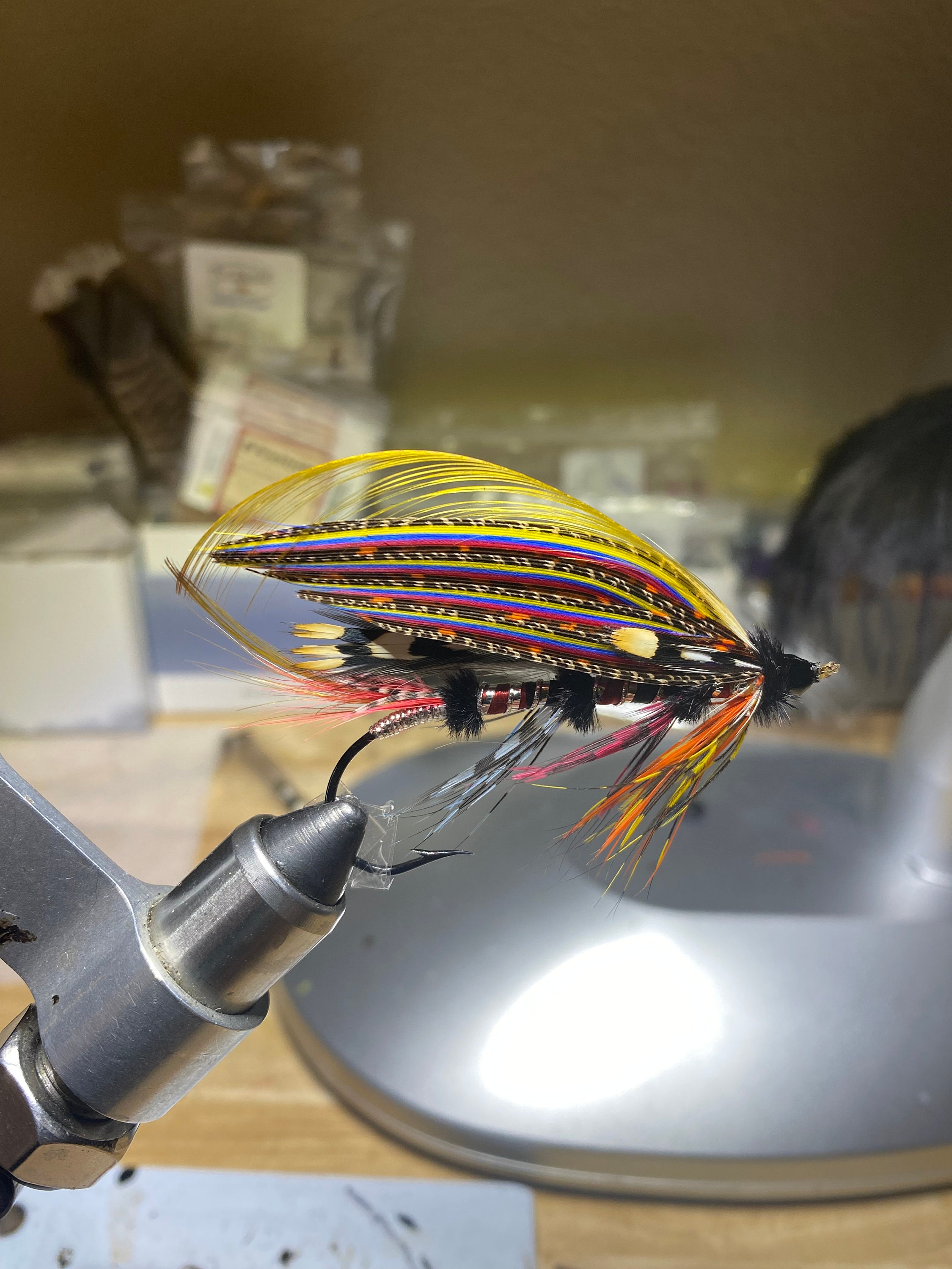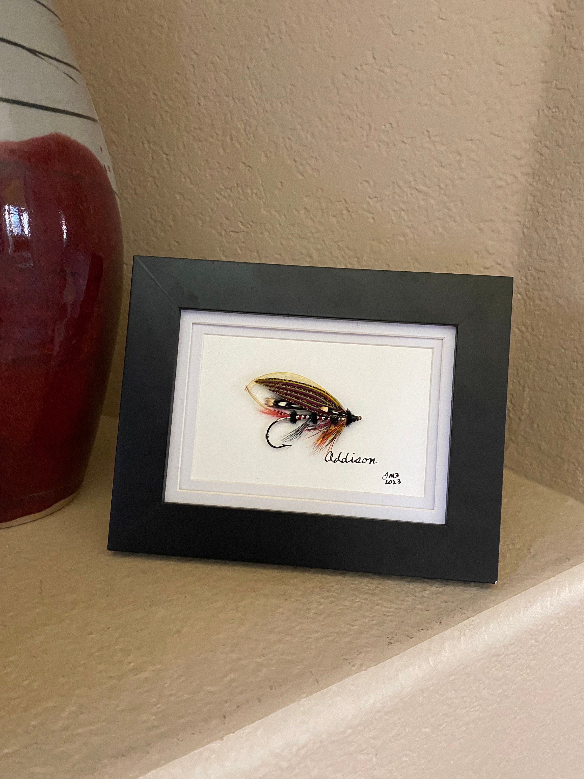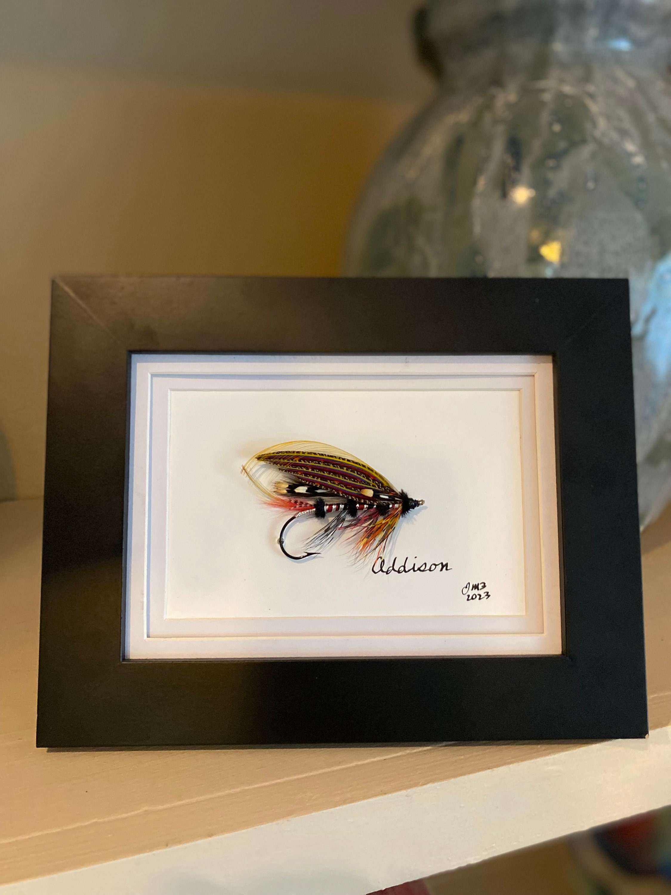 As a lifelong trout & salmon fly fishing and tying enthusiast, I enjoy dressing and sharing artistic expression through classic and authentic fly design – Addison is a freehand design - dressed on a 5/0 2x Garamond blind eye hook with a Spanish silk gut loop. A list of all feathers and materials is included with each fly. *All materials and feathers are procured from ethically sourced providers.