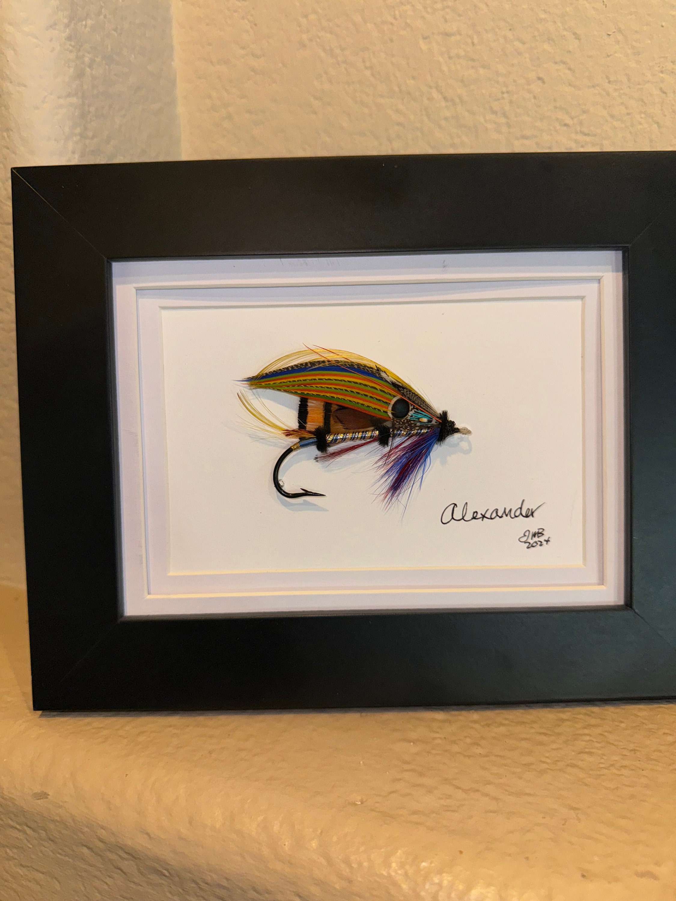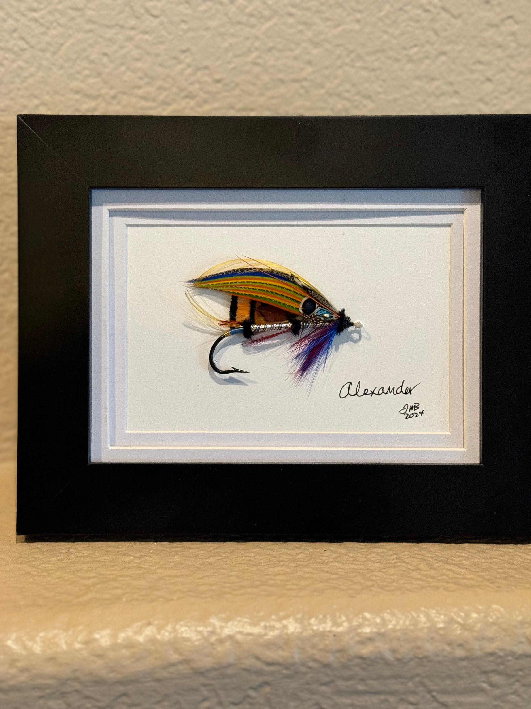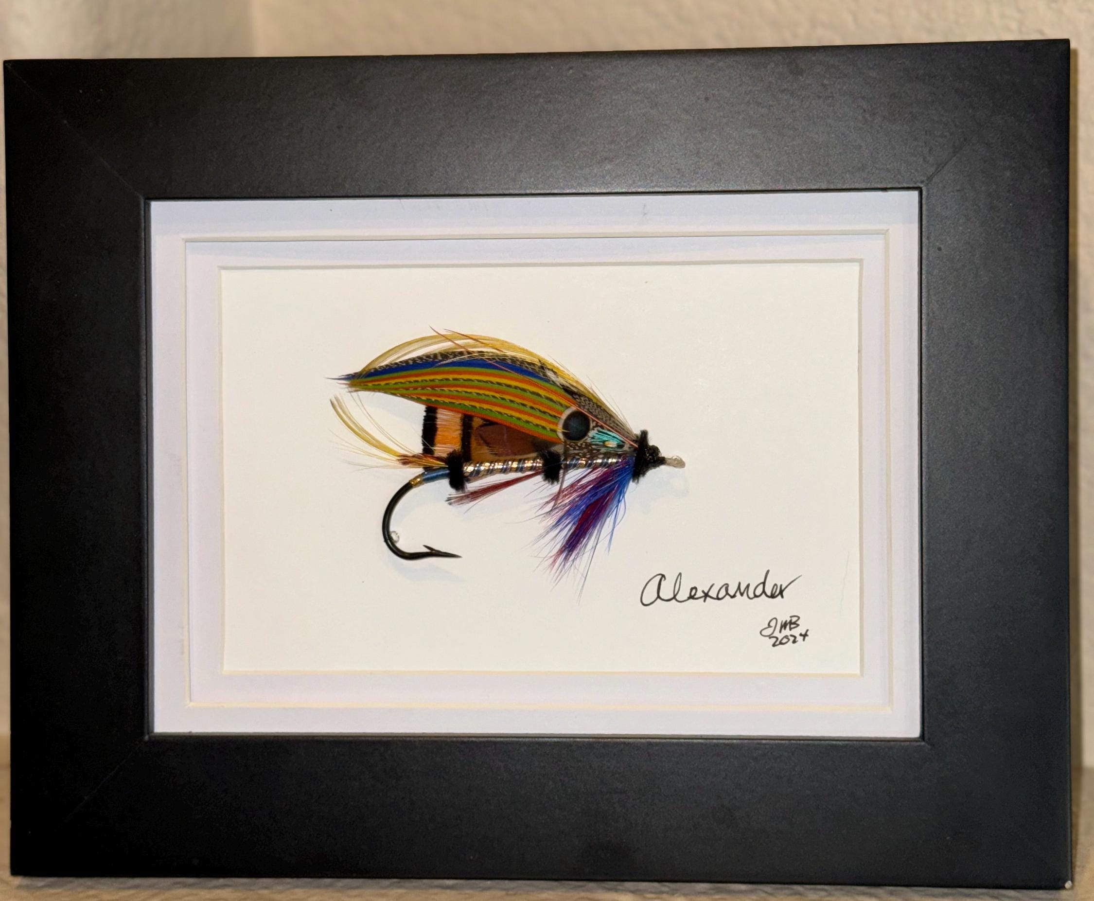 As a lifelong trout & salmon fly fishing and tying enthusiast, I enjoy dressing and sharing artistic expression through classic and authentic fly design –Alexander- is a freestyle fly dressed on a 6/0 Partridge blind eye hook with a Spanish silk gut loop. A list of all feathers and materials is included with each fly. *All materials and feathers are procured from ethically sourced providers
