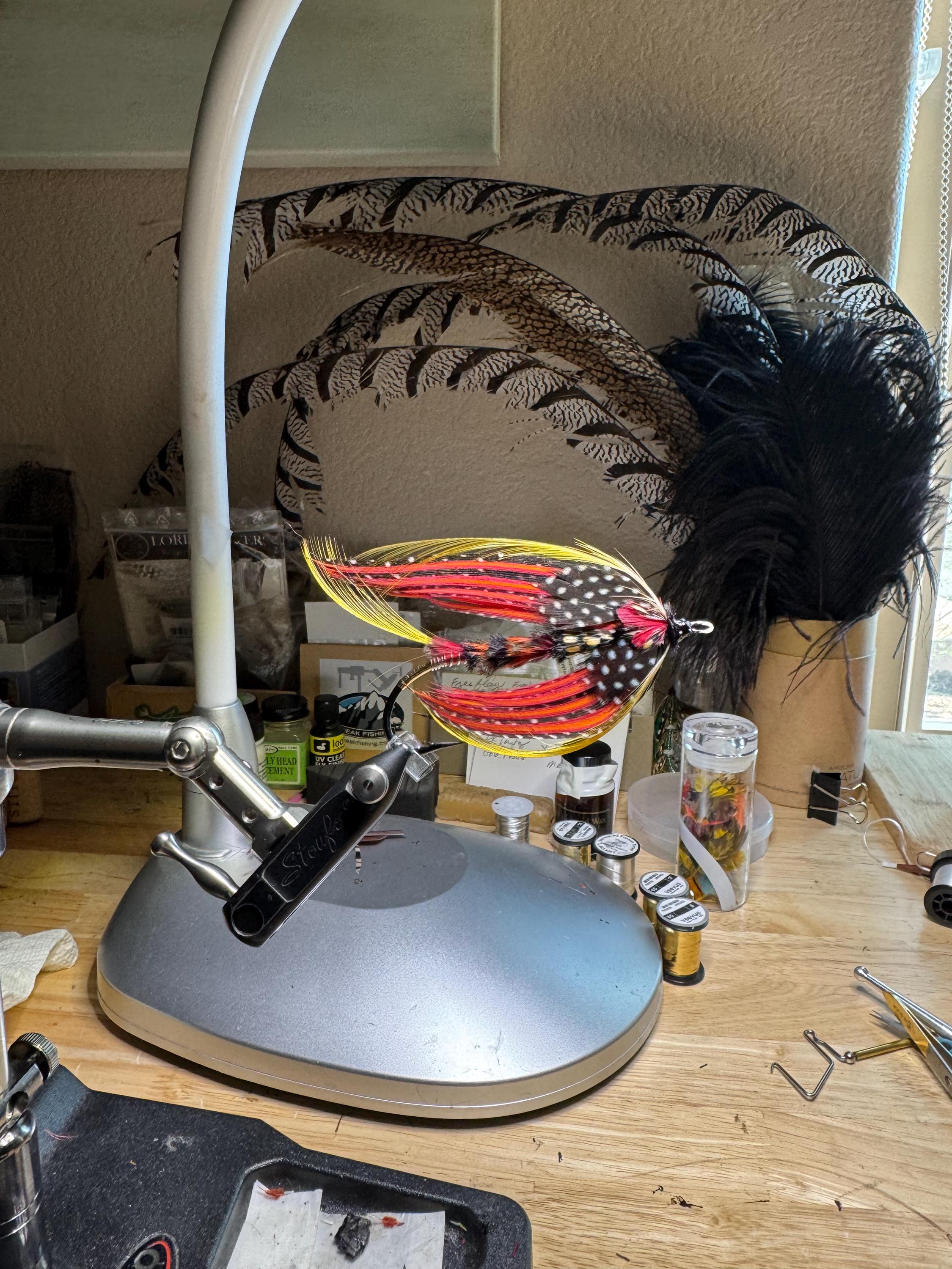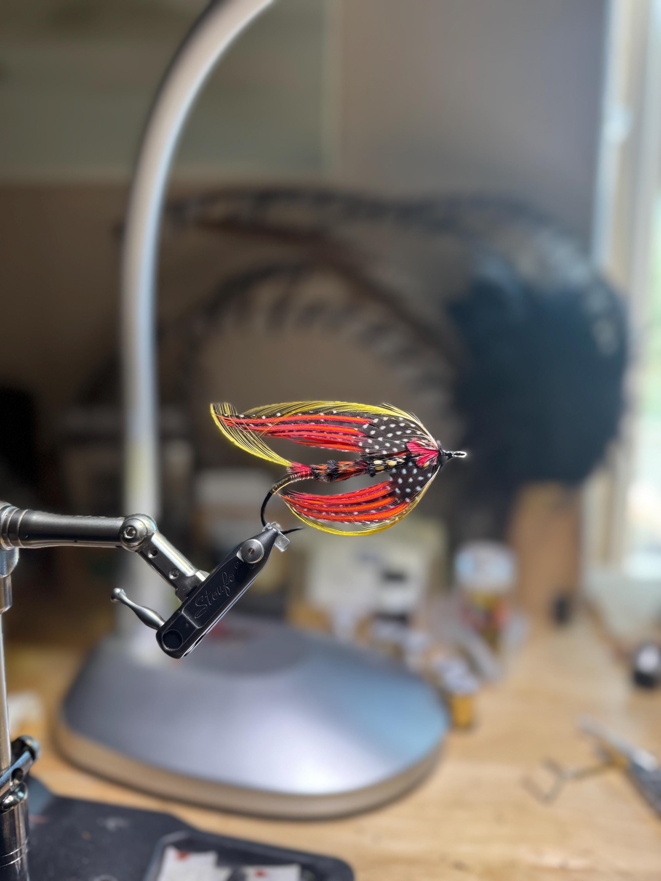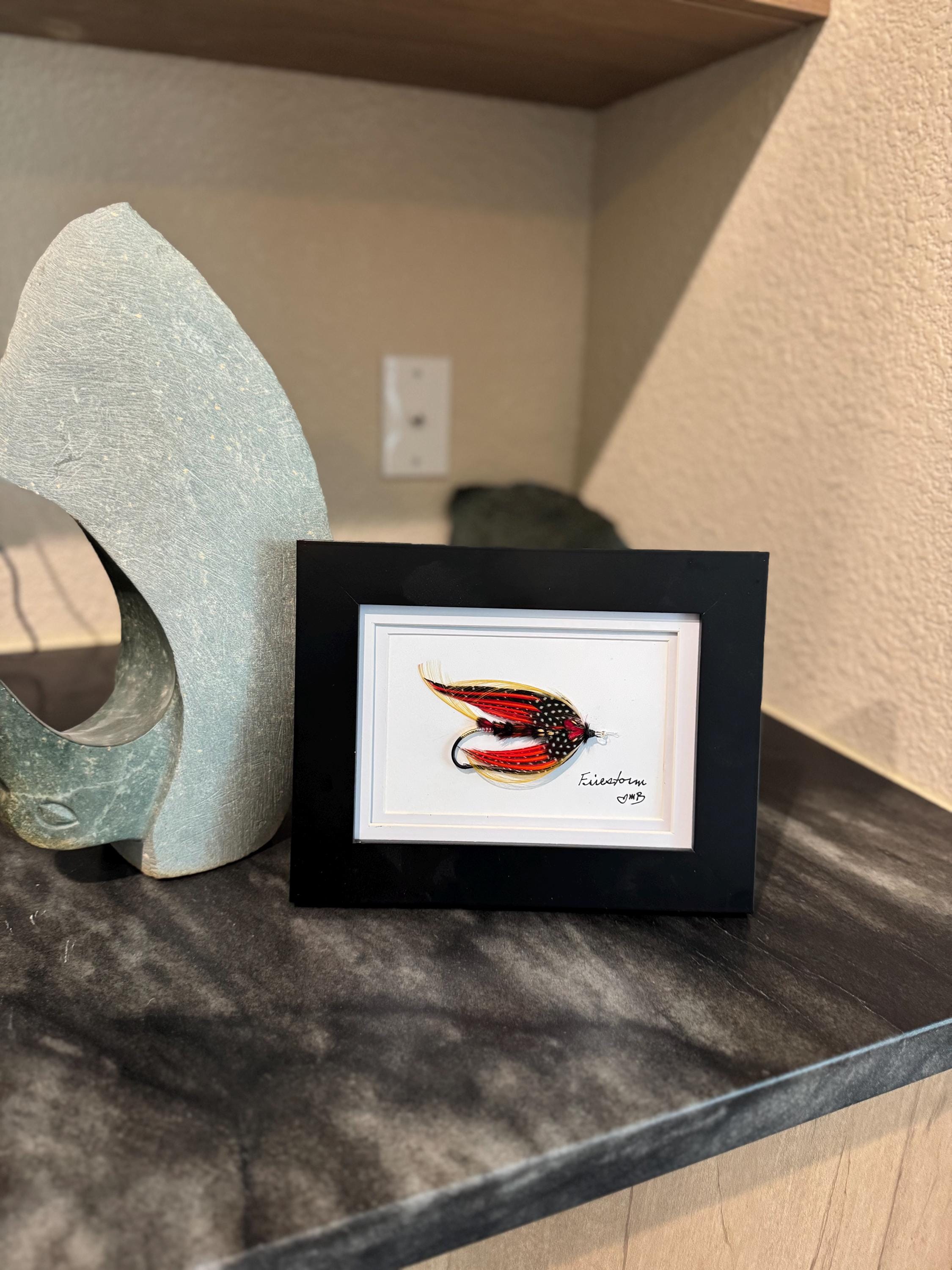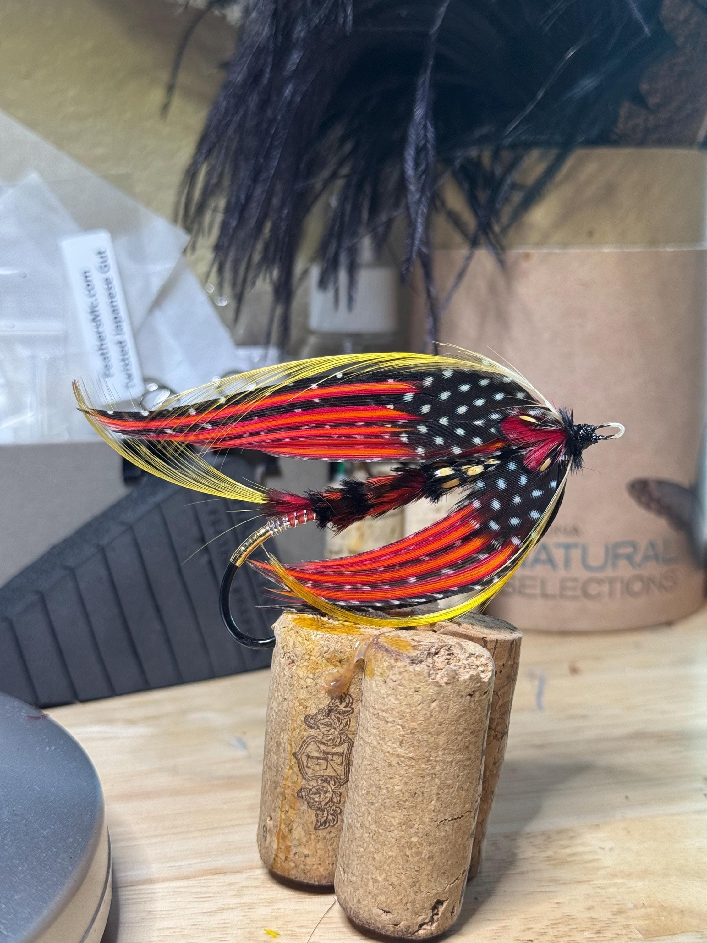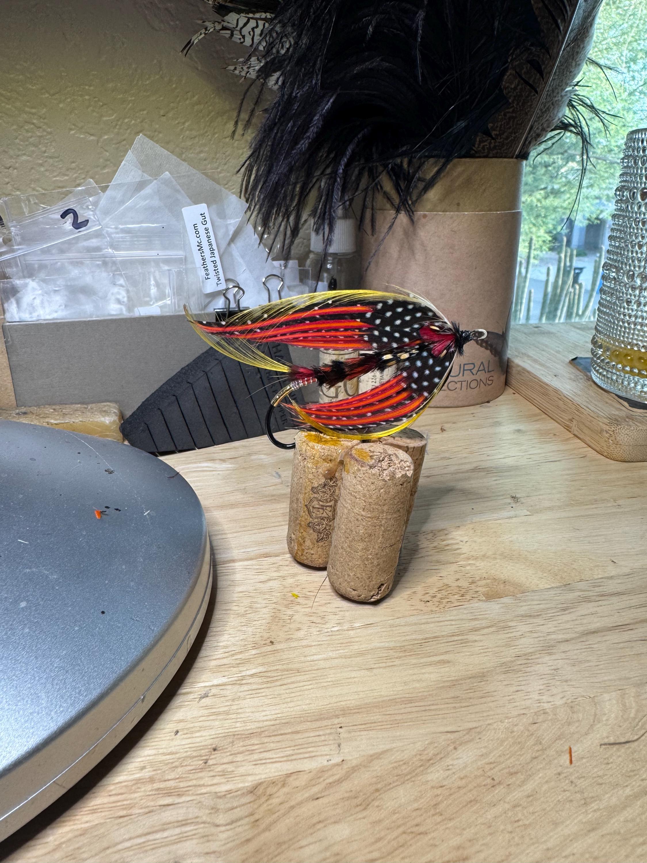 As a lifelong trout & salmon fly fishing and tying enthusiast, I enjoy dressing and sharing artistic expression through classic and authentic fly design –Firestorm is an original freestyle fly dressed on a 7/0 Partridge blind eye hook with silk gut loop. A list of all feathers and materials is included with each fly. *All materials and feathers are procured from ethically sourced providers